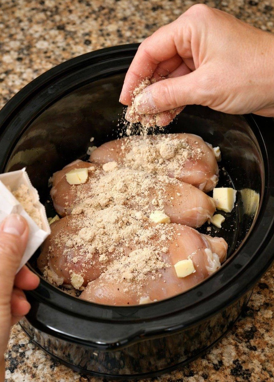 Evenly sprinkle dry gravy mix over the chicken. -