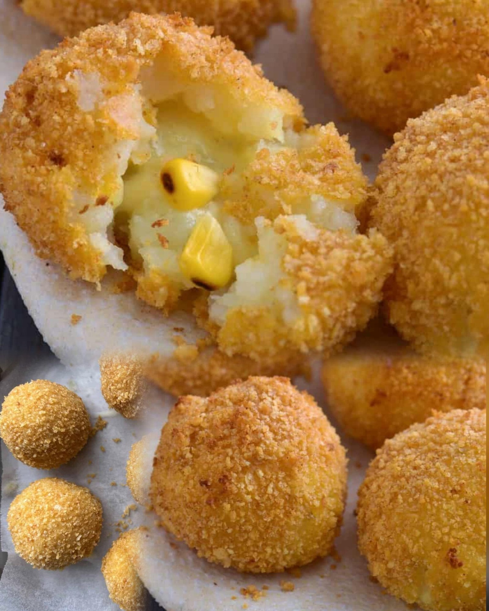 You can also add fresh corn to the cheese mix to make corn cheese balls. Mozzarella mashed potatoes and spices make a delicious air fryer potato bites recipe.