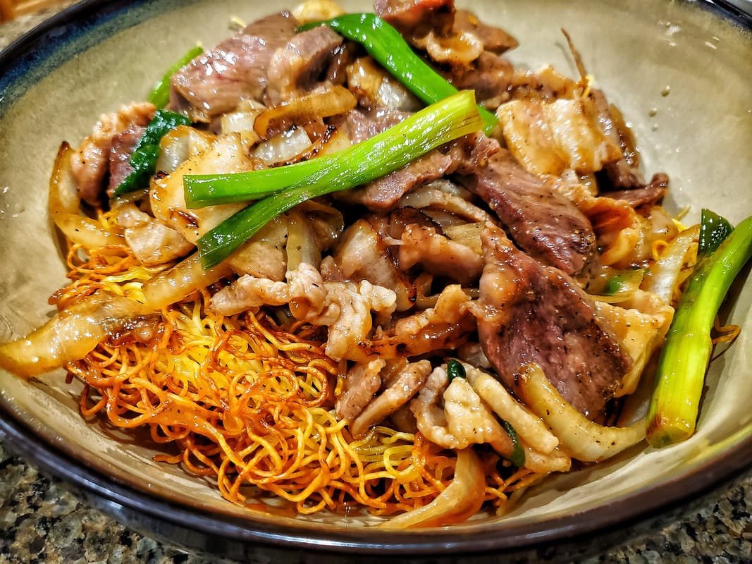 - Once airfried chow mein noodles reach the desired crispness, put onto a large plate and spoon the beef and onions sauce on top. Garnish with more scallions if desired and enjoy!