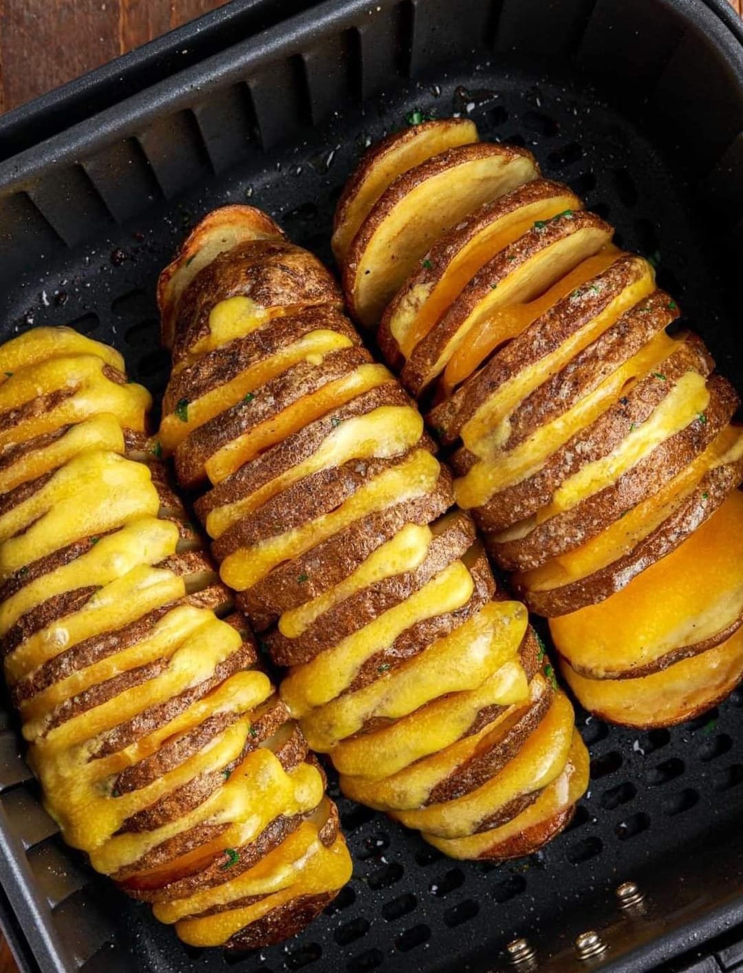 Air Fryer Cheesy Hasselback Potatoes are a delicious side dish cooked in garlic butter and topped with cheese, sour cream, and chives
