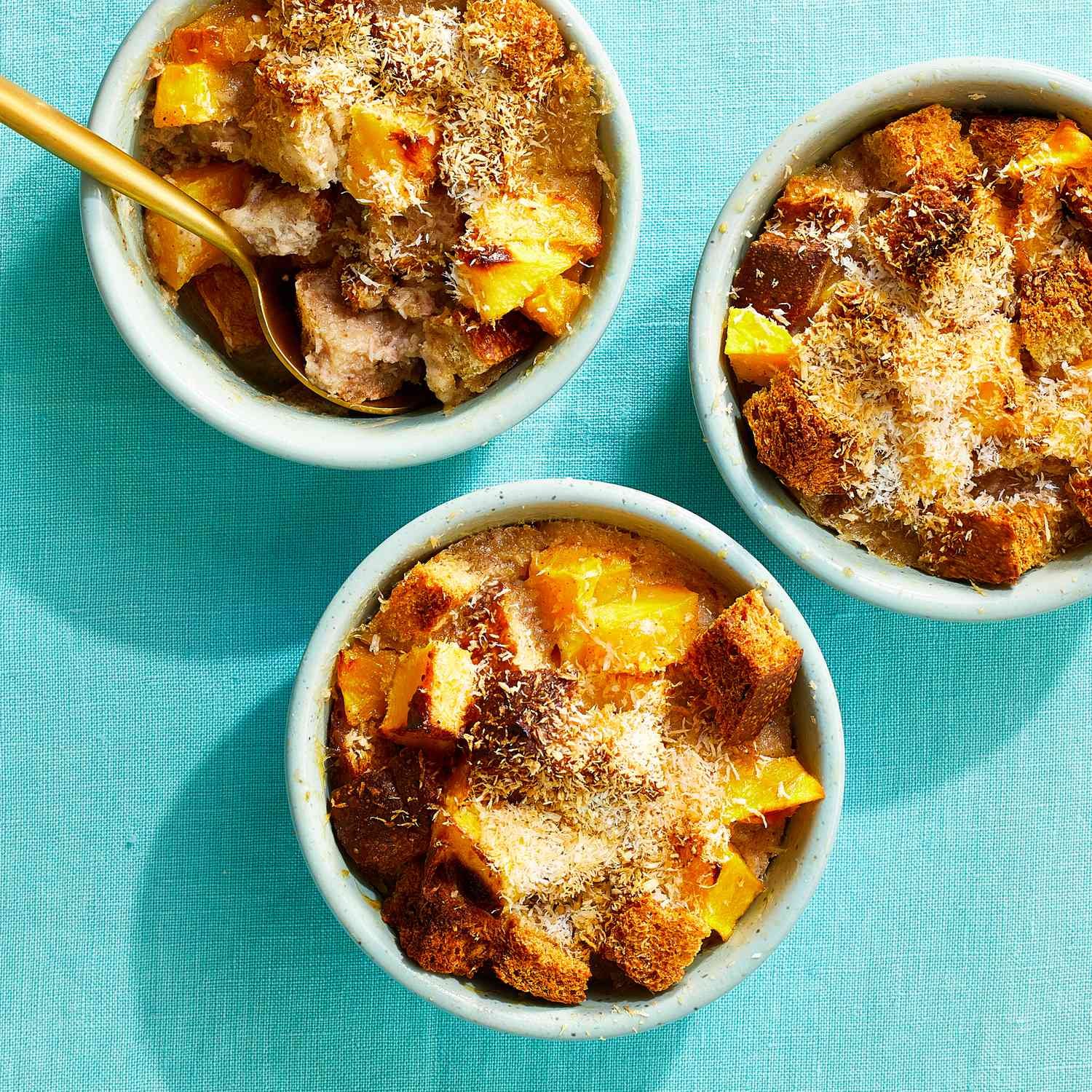 - Coat six 8-ounce ramekins with cooking spray. Combine bread cubes and mango (or pineapple) in a medium bowl. Divide the mixture among the prepared ramekins.