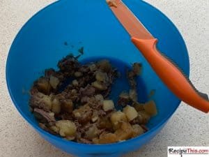 1. Make sure all of the liquid has been drained before adding leftover beef stew to a bowl and seasoning it with salt, pepper, and mixed herbs.