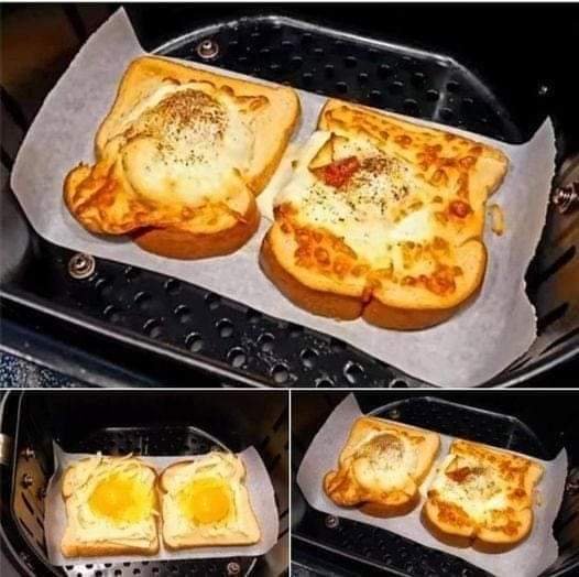 - Put the bread in the basket of the air fryer. Cover each slice of bread with cheese, then delicately crack an egg in the middle. To taste, add a little salt and pepper.