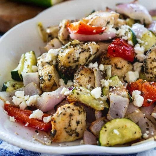 Air Fryer Greek Chicken is a dish that consists of chopped chicken, red bell pepper, red onion and zucchini that are mixed with Greek spices and sprinkled with feta cheese. Within less than half an hour, you can prepare this low-carb lunch using an air fryer.