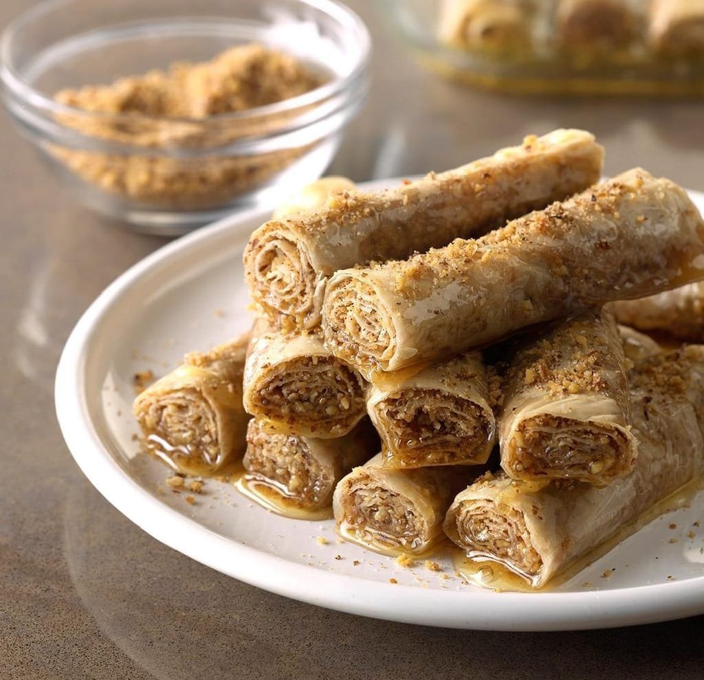 2. Place 1 sheet of phyllo dough on a 15×12-in. piece of waxed paper; brush with butter. Place a second phyllo sheet on top, brushing it with butter. (Keep remaining phyllo covered with a damp towel to prevent it from drying out.) Sprinkle with 1/4 cup walnut mixture. Using waxed paper, roll up tightly jelly-roll style, starting with a long side, removing paper as you roll. Slice roll into 4 smaller rolls. Brush with butter; secure with toothpicks. Repeat with remaining phyllo dough and 1/4 cups of walnut mixture. In batches, place in a single layer on greased tray in air-fryer basket. Cook until light brown, 9-11 minutes. Cool on a wire rack. Discard toothpicks.