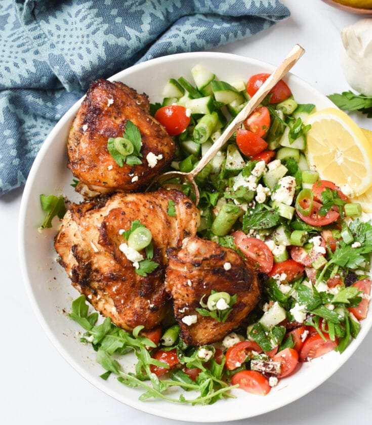 - Arrange the Mediterranean Salad onto a platter’s bottom. Arrange the chicken thighs onto the salad and scatter the feta cheese and parsley on top. Have fun!