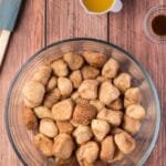 - cut the biscuits, add the pieces to the bowl with the cinnamon sugar and shake to coat.