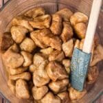 - Melt the butter in a small bowl and mix in the vanilla. Coat the pieces of biscuit in cinnamon sugar by pouring over them and stirring. (This is how the delicious sauce is made.)