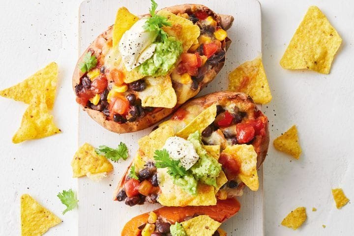 - Lift the sweet potatoes into the air fryer basket with caution. Cook for 3 minutes at 180°C, or until cheese is melted and thoroughly cooked. Add some corn chips and the leftover cheddar on top to serve. Simmer for an additional two minutes, or until the cheese is melted. Lift the sweet potatoes onto serving plates with care. Add more sauce or salsa, 1/2 mashed avocado, 2 tbsp Bulla Light Sour Cream, and 2 tsp minced fresh coriander leaves over top. After seasoning, serve.