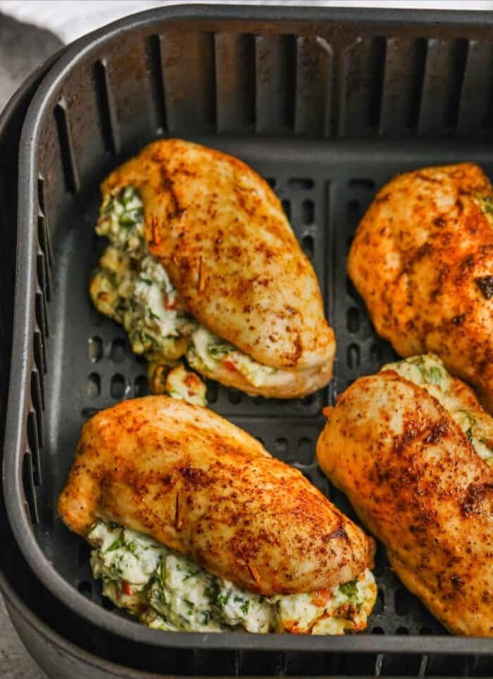 ◾No Air Fryer? No Problem! These stuffed chicken breasts can be baked in the oven at 375°F for 32-37 minutes or until they reach 165°F.