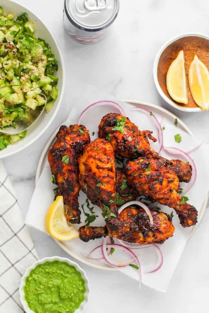 Tandoori chicken legs are perfect for family dinners or as the main dish at parties and get-togethers. Chicken drumsticks are inexpensive and harder to overcook so they are a good choice for larger gatherings. Believe me, just looking at the plate piled high with spiced tandoori chicken is going to make everyone hungry if the aroma filling the house doesn’t do it first.