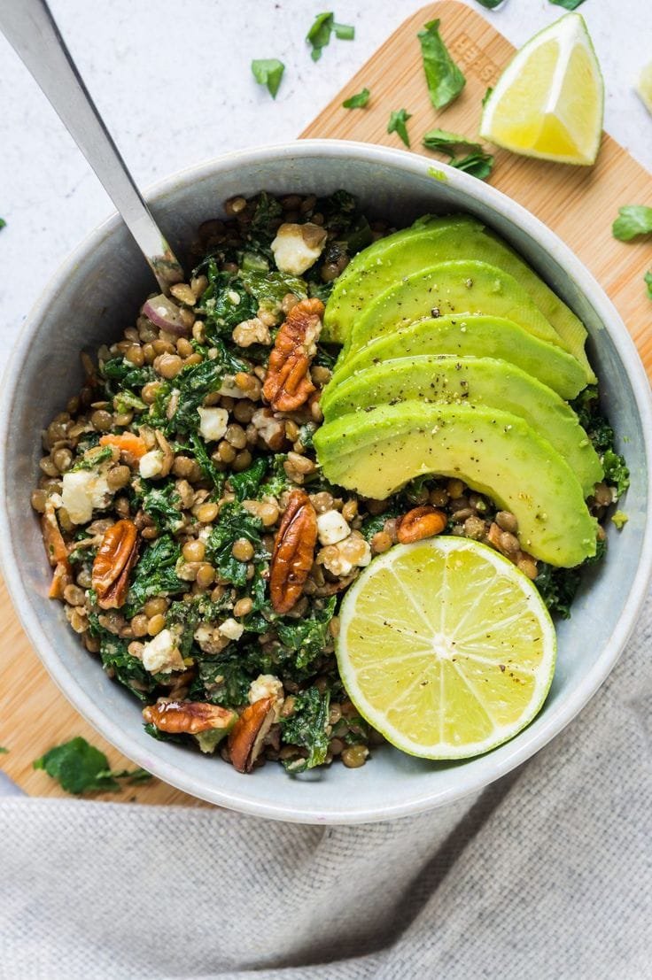 Anti inflammatory kale and lentil salad with avocado