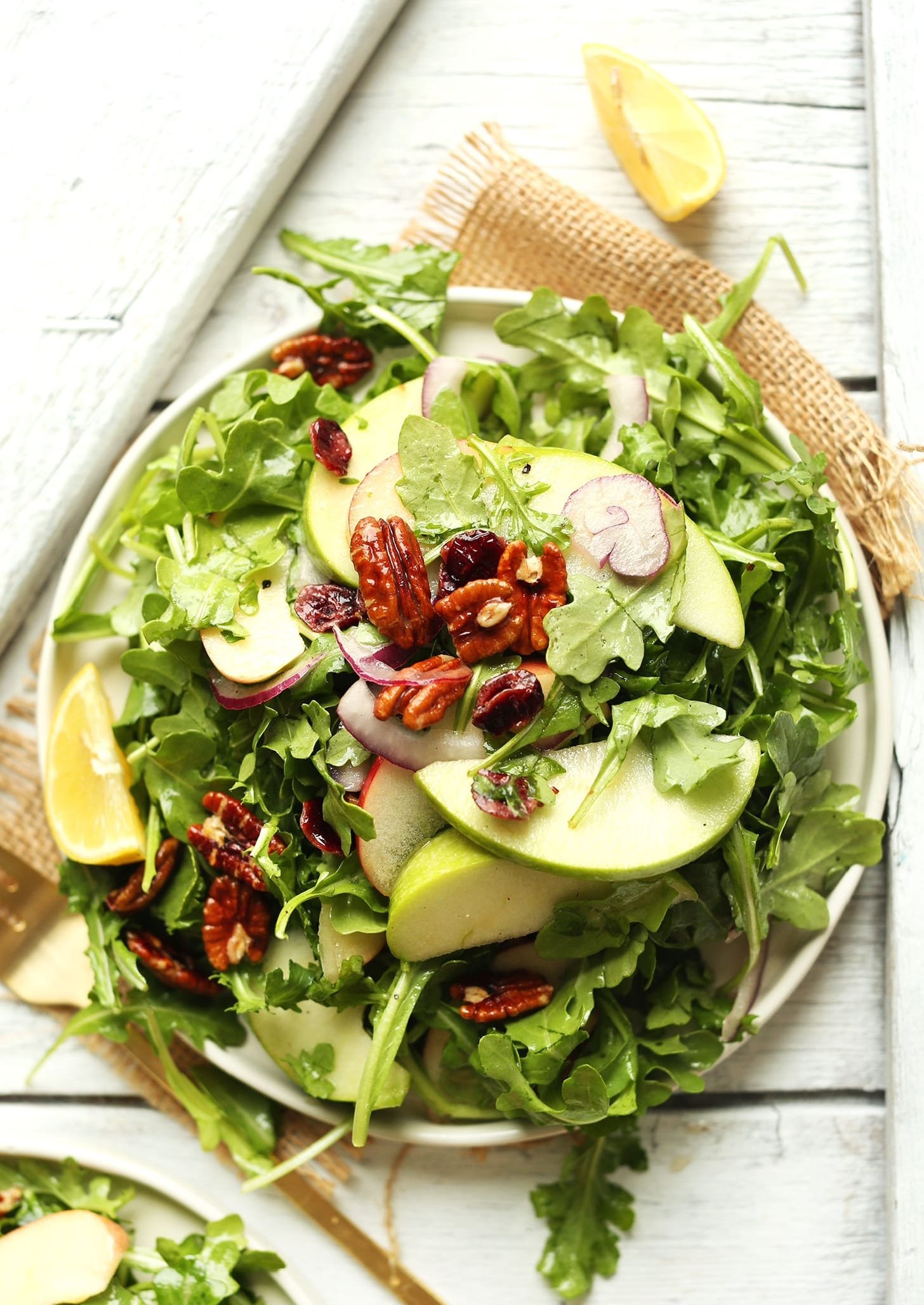A healthy, hearty fall salad with peppery arugula, crisp apples, and toasted pecans. Dressed in a simple, vibrant lemon vinaigrette, it makes the perfect light-yet-satisfying plant-based meal or side.