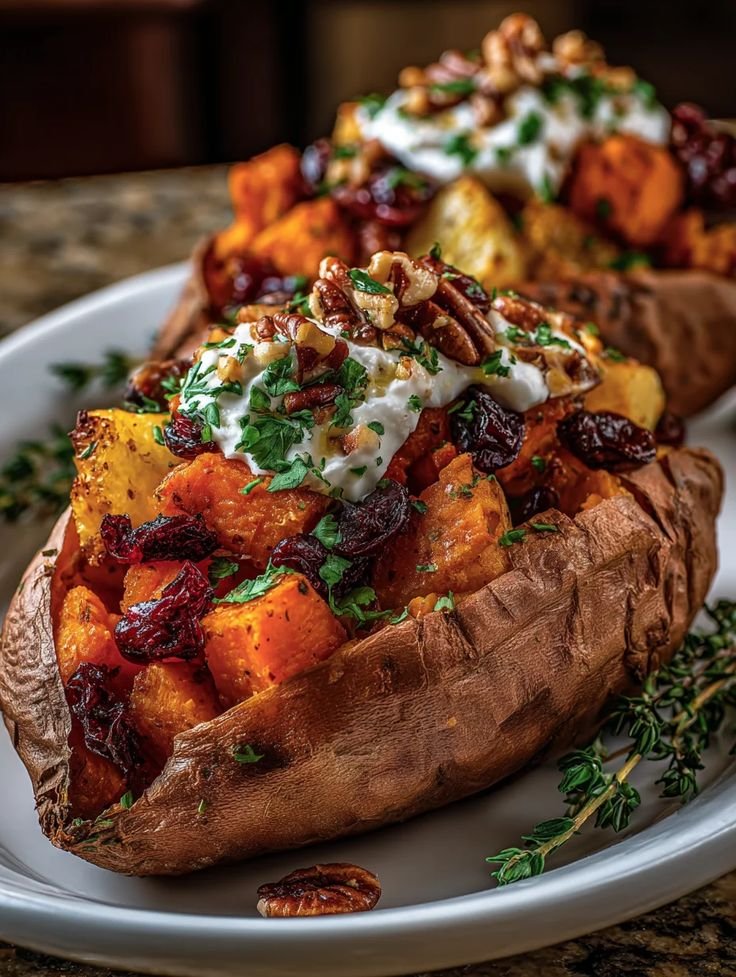 Soft roasted sweet potatoes filled with warm cinnamon-spiced apples, a touch of maple, and crunchy nuts. Comforting, wholesome, and perfect as a breakfast, snack, or side dish.