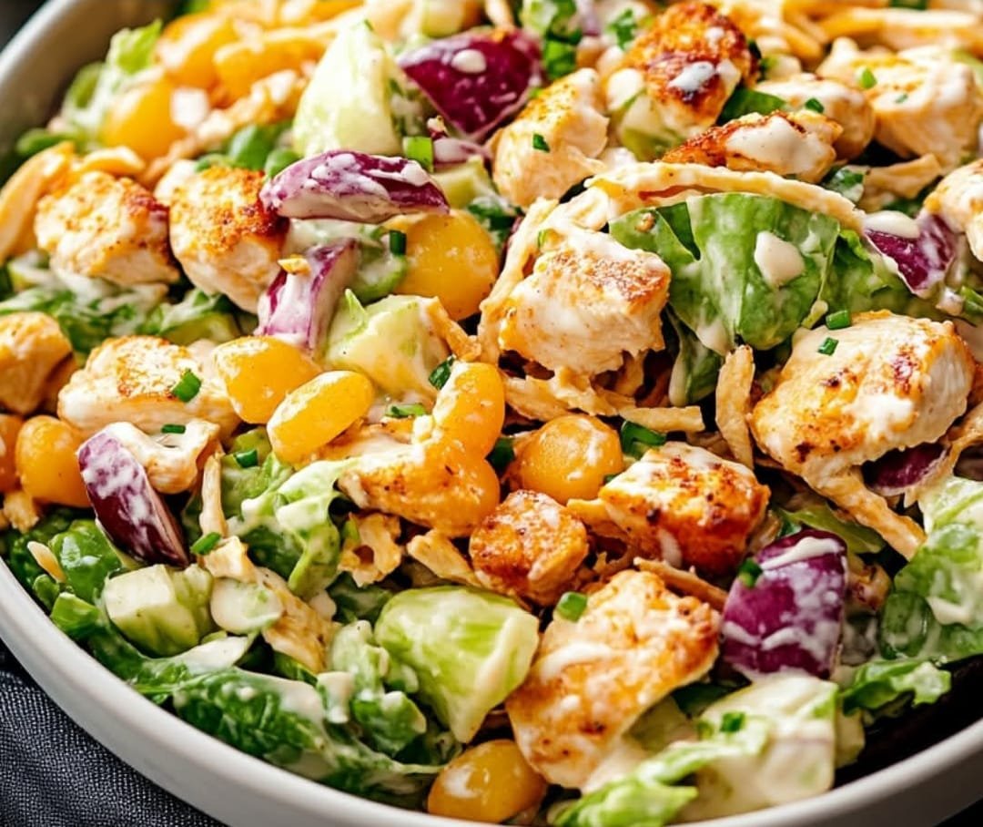 This copycat Applebee’s Chicken Salad features crispy golden chicken tenders served over a fresh bed of romaine lettuce, shredded cabbage, carrots, crunchy chow mein noodles, and toasted almonds, all tossed in a sweet and tangy creamy Oriental-style dressing. It’s hearty, crisp, refreshing—and incredibly satisfying!