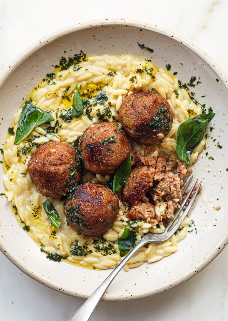 Juicy, tender meatballs flavored with rosemary, garlic, and finely chopped dried apricot for natural sweetness. They’re simmered in a light broth and served over creamy lemon-parmesan orzo, a Mediterranean-style comfort dish that’s filling but still bright and fresh.
