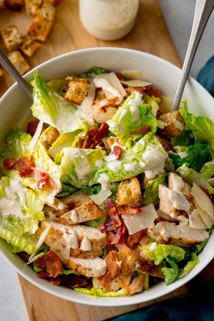 Mediterranean tender chicken crispy bacon homemade courton crunchy roman lettuce with easy caesar dressing