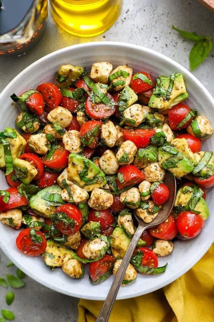 Quick, refreshing & perfect for summer! This avocado caprese salad is bursting with seasonal tomatoes, creamy avocado, fresh mozzarella & sliced basil! Serve it as an appetizer or side dish with your favorite protein!