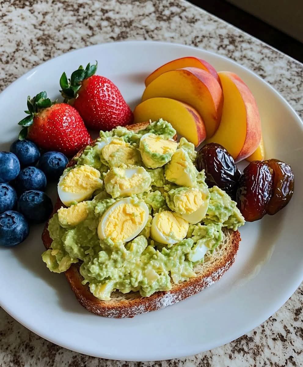 A balanced breakfast or brunch plate combining creamy avocado egg salad, crispy toast, juicy fresh fruit, and naturally sweet stuffed dates. This dish delivers healthy fats, protein, fiber, antioxidants, and a little natural dessert all in one.