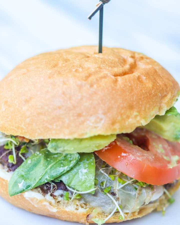 On the bottom bun, add lettuce (if using), the cheesy burger patty, avocado slices or mash, and tomato/onion if desired.