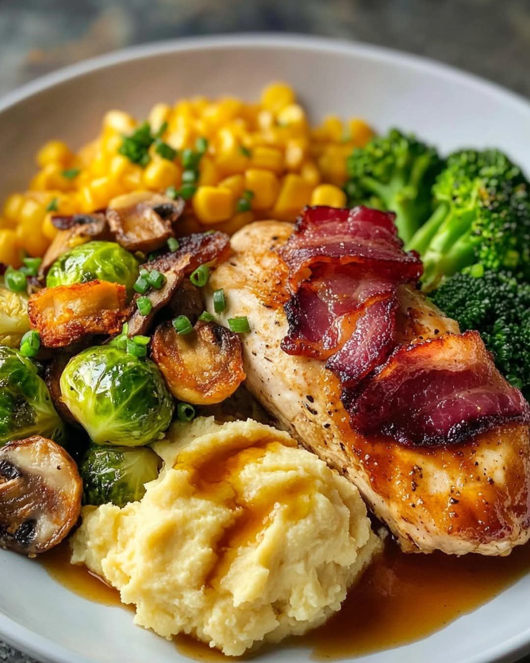This bacon-topped chicken served with creamy garlic mashed potatoes and roasted veggies is a hearty, flavorful meal that combines crispy bacon, juicy chicken, and a rich, buttery mash. The roasted vegetables add color, crunch, and a nutritional boost, making this a well-balanced dish.