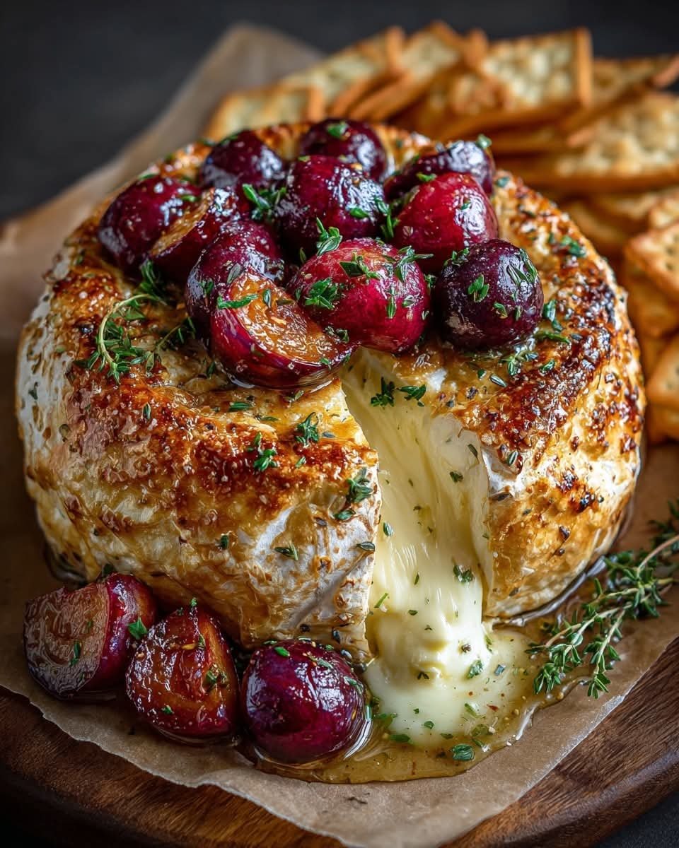 Baked brie transforms from a firm cheese into a silky, gooey center surrounded by a soft rind. When paired with roasted plums, their natural sweetness intensifies as they caramelize in the oven. The thyme brings a fresh herbal aroma that balances the fruity richness, while honey adds a glossy finishing touch. Every bite is warm, creamy, slightly tart, and beautifully fragrant.