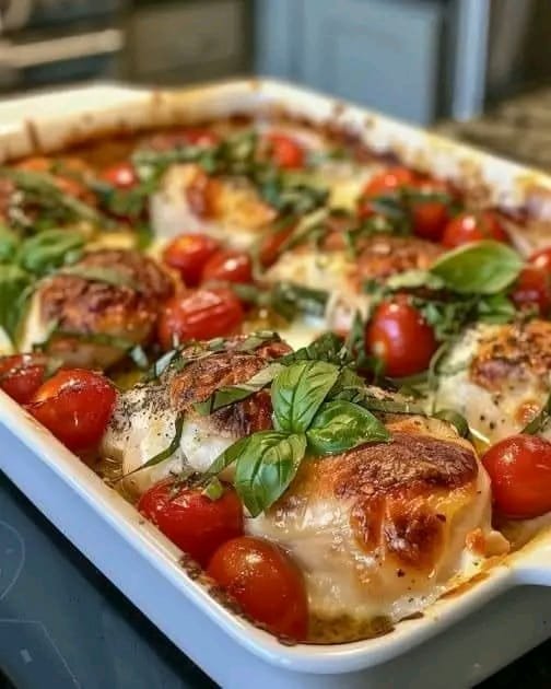Baked Chicken with Tomatoes and Basil is a simple yet flavorful dish that combines juicy, tender chicken with the bright flavors of ripe tomatoes and aromatic basil. The chicken is seasoned with herbs and spices, then baked with a topping of sliced tomatoes and fresh basil leaves. As it cooks, the tomatoes release their juices, creating a light, savory sauce that infuses the chicken with rich flavor. This dish is ideal for a healthy, weeknight dinner or a casual gathering, and pairs beautifully with a side of rice, pasta, or crusty bread to soak up the delicious sauce.