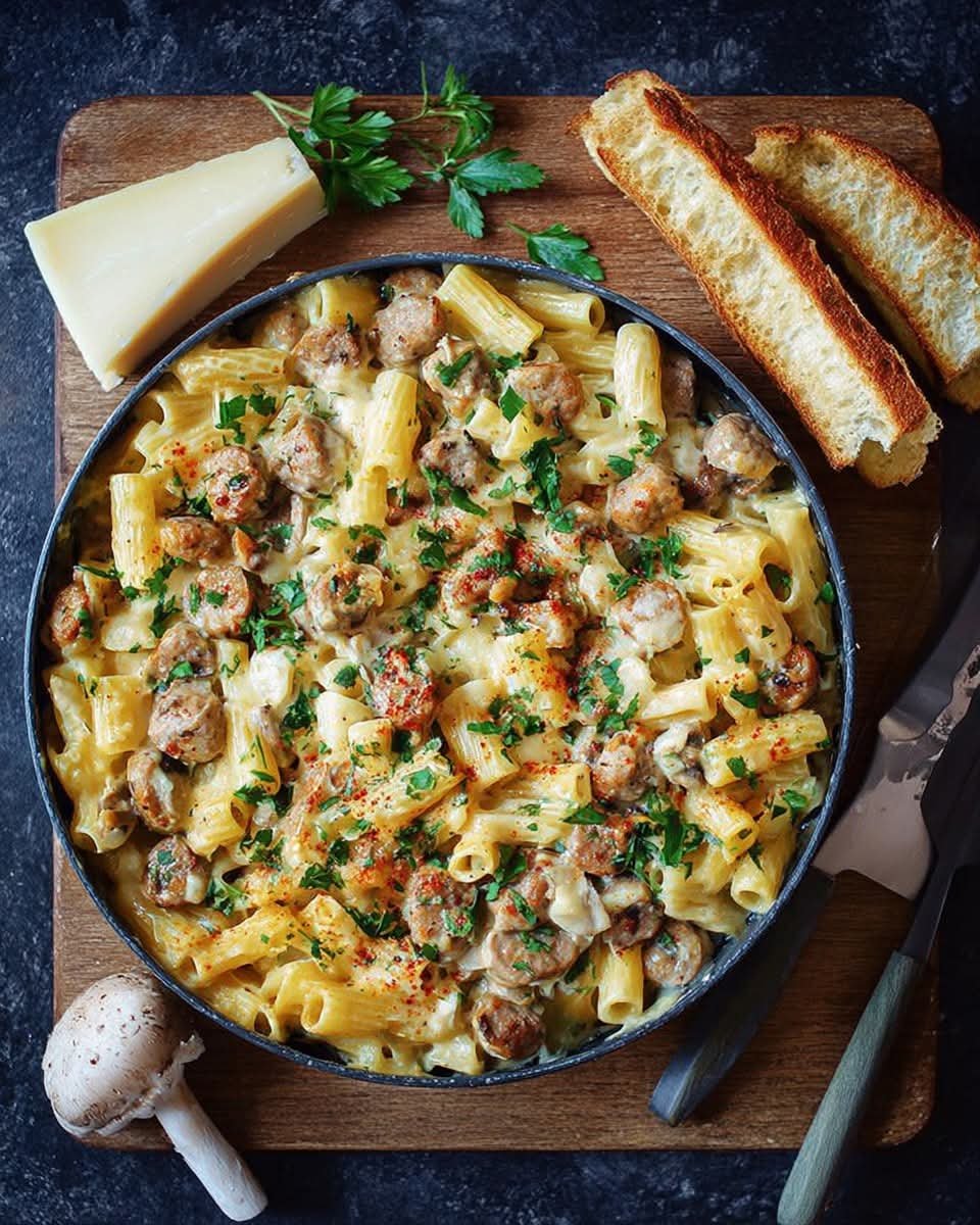 This baked creamy sausage rigatoni is comfort food at its finest. Hearty rigatoni pasta is tossed with a rich cream sauce, spicy Italian sausage, aromatic herbs, and plenty of cheese—then baked until bubbling and golden on top. It’s perfect for cozy dinners or feeding a hungry crowd.
