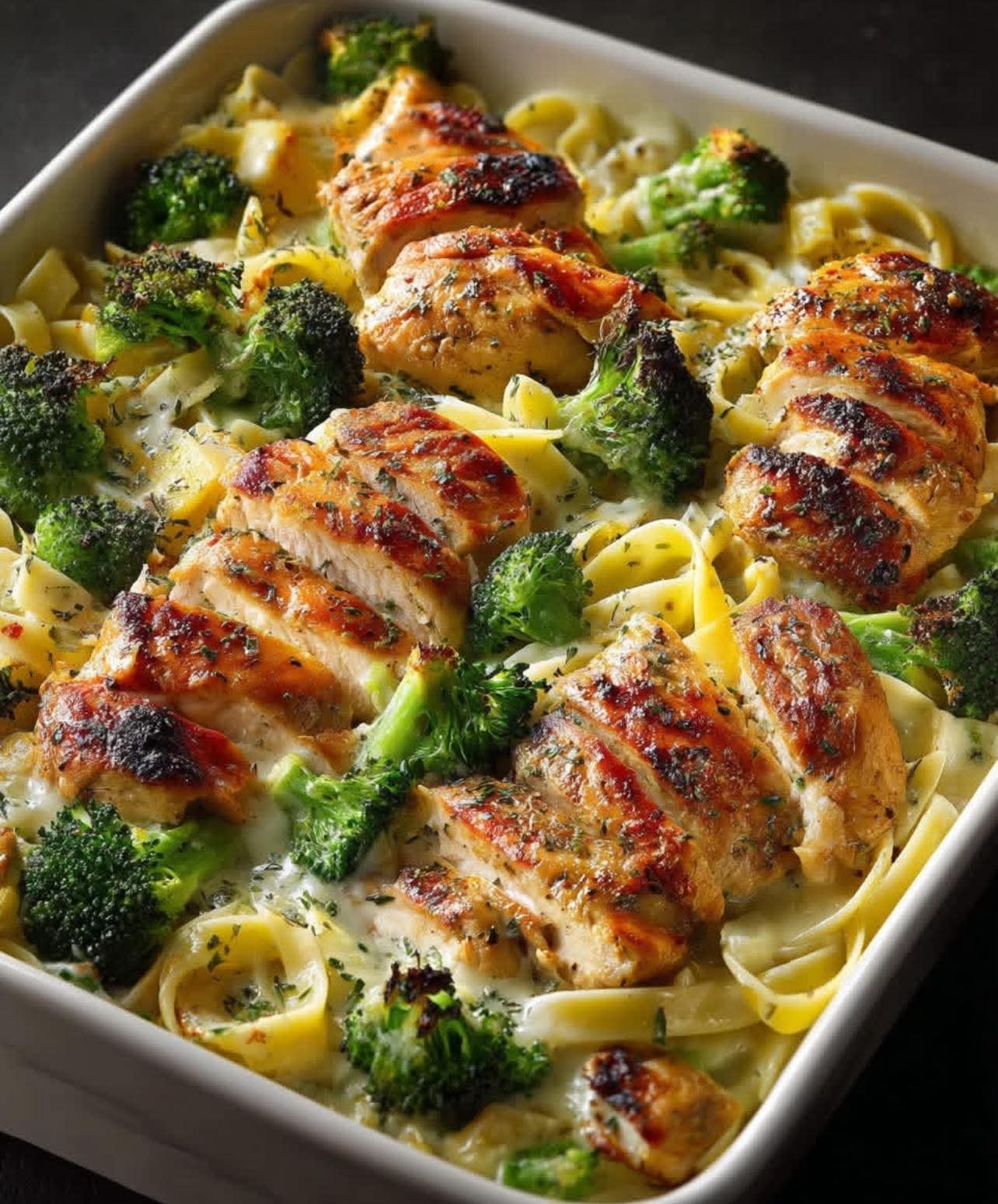 This baked fettuccine Alfredo is a cozy, Mediterranean-friendly comfort dish made lighter with olive oil, milk, and Greek yogurt instead of heavy cream. Juicy grilled chicken, tender broccoli, and roasted baby potatoes make it a complete, family-style meal—rich, creamy, and non-spicy.