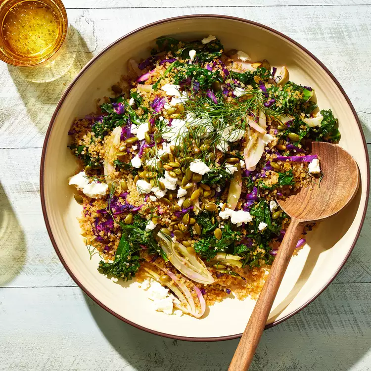 Crisping the quinoa in the oven adds delicious texture to this bright and filling kale salad. The lemon-honey-garlic dressing complements the sweetness from the roasted vegetables. Topping the salad with feta and pepitas gives it a savory note.