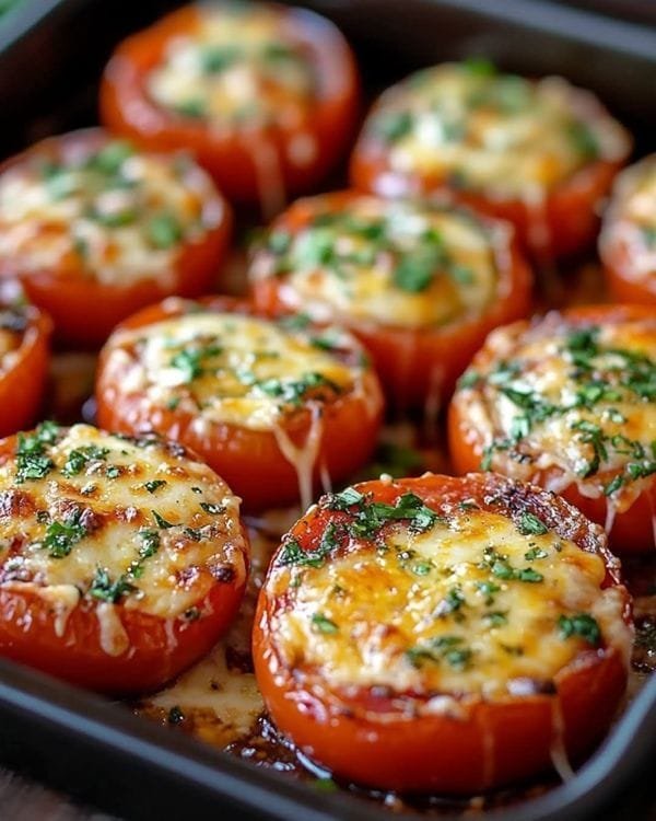 Juicy, ripe tomatoes are halved and topped with freshly grated Parmesan cheese, garlic, herbs, and olive oil, then baked until bubbly and golden. This quick Mediterranean-friendly side dish is perfect with grilled meats, fish, pasta, or on its own as a snack.