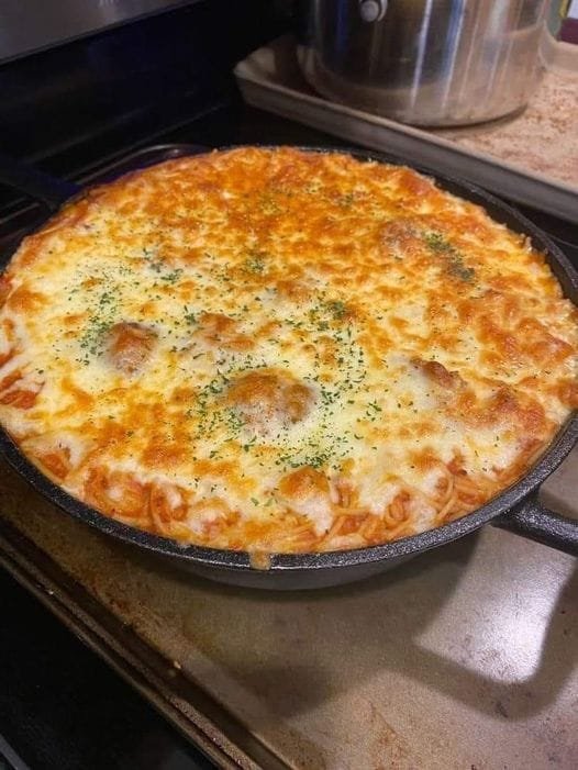 It is topped with shredded mozzarella cheese that is fat-free. - The cheese should be melted and bubbling after about 20 to 25 minutes of baking at 375 degrees Fahrenheit.