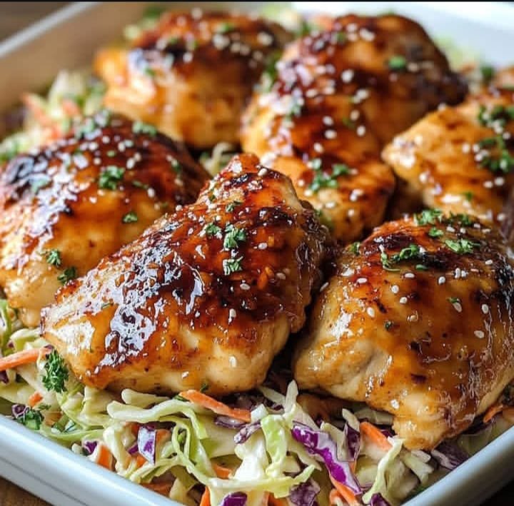 This dish combines juicy oven-baked chicken glazed in a sticky sweet chili sauce with a cool, crunchy creamy slaw. It’s the perfect balance of sweet, tangy, and savory—great for weeknight dinners or casual gatherings.