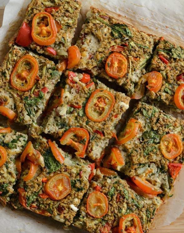 This savory oatmeal bake is loaded with colorful vegetables, oats, and herbs — baked into a soft, flavorful, and satisfying dish. It’s a great high-fiber, high-protein meal that’s Mediterranean-inspired, warm, and comforting.