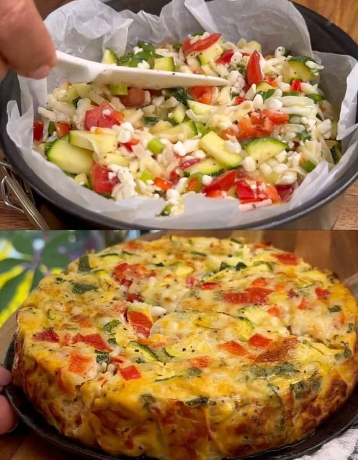 Add the beaten eggs, chopped zucchini, bell pepper, green onions, tomatoes, cottage cheese, and mozzarella cheese.