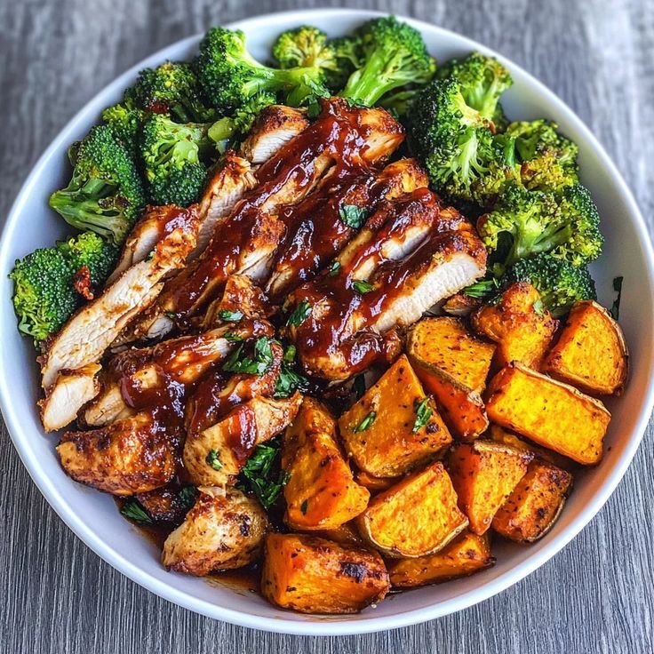 A nourishing bowl featuring juicy BBQ chicken, perfectly roasted sweet potatoes, and fresh veggies, all drizzled with a light creamy sauce. Sweet–savory flavor balance, high protein, and easy to meal prep.