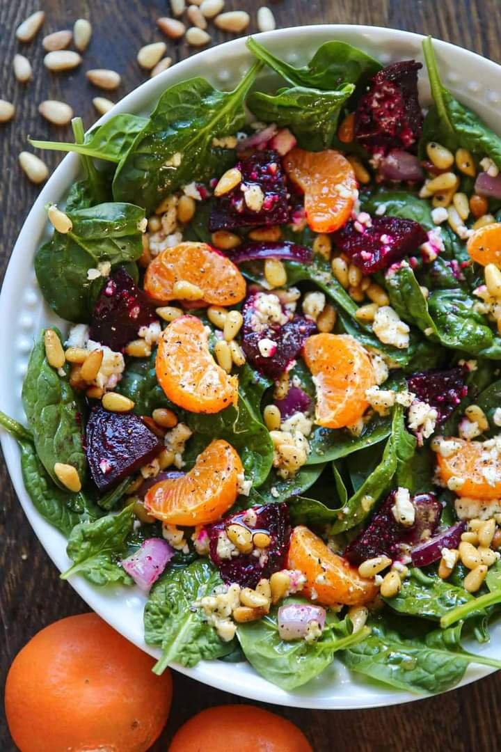 Beet Salad with Spinach, Feta, Oranges, Pine Nuts, and Honey-Mustard Lemon Dressing