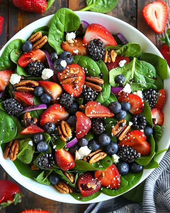Indulge in the sweet and savory flavors of our Berry Spinach Salad with Pecans, Feta, and Balsamic Glaze! This refreshing salad combines the tender freshness of baby spinach, the sweetness of mixed berries, the crunch of toasted pecans, and the tanginess of crumbled feta cheese, all tied together with a rich and velvety balsamic glaze.