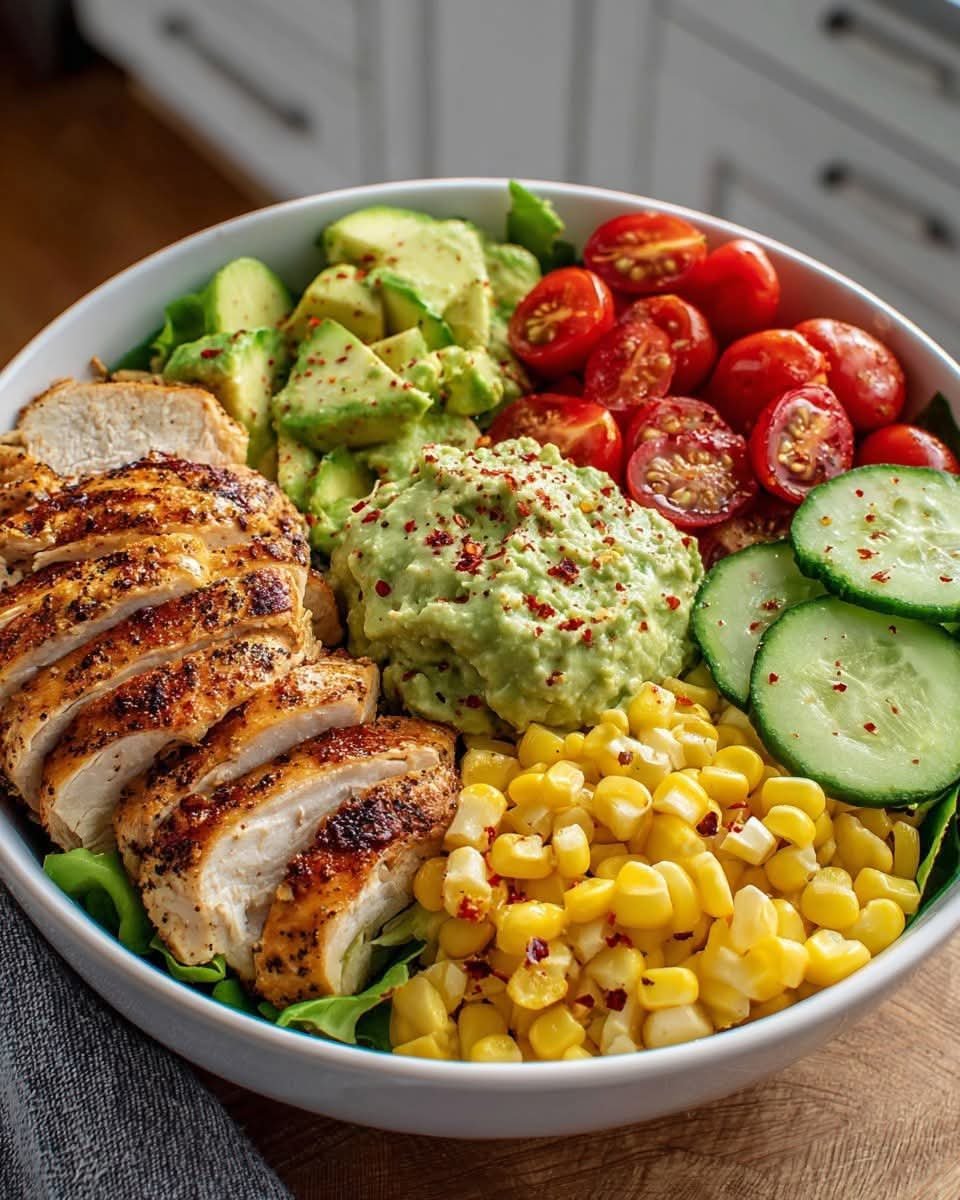 This grilled chicken burrito bowl combines smoky, tender chicken, fluffy cilantro-lime rice, creamy avocado, black beans, roasted corn, fresh salsa, and tangy dressing — all layered in one hearty, satisfying bowl. It’s a perfect mix of protein, fiber, and fresh flavor — and it’s easy to meal-prep or customize to your liking