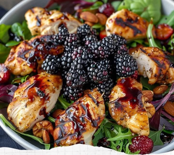 The Blackberry Balsamic Grilled Chicken Salad is a delicious, nutrient-packed meal that combines fresh, sweet, and savory elements in each bite. The juicy grilled chicken pairs perfectly with the tangy blackberry balsamic dressing, creating a well-balanced dish that’s perfect for lunch or dinner. Whether you’re looking for a light yet filling meal or a vibrant salad to impress your guests, this recipe is sure to become a favorite. Enjoy the balance of flavors and the burst of freshness with every bite!