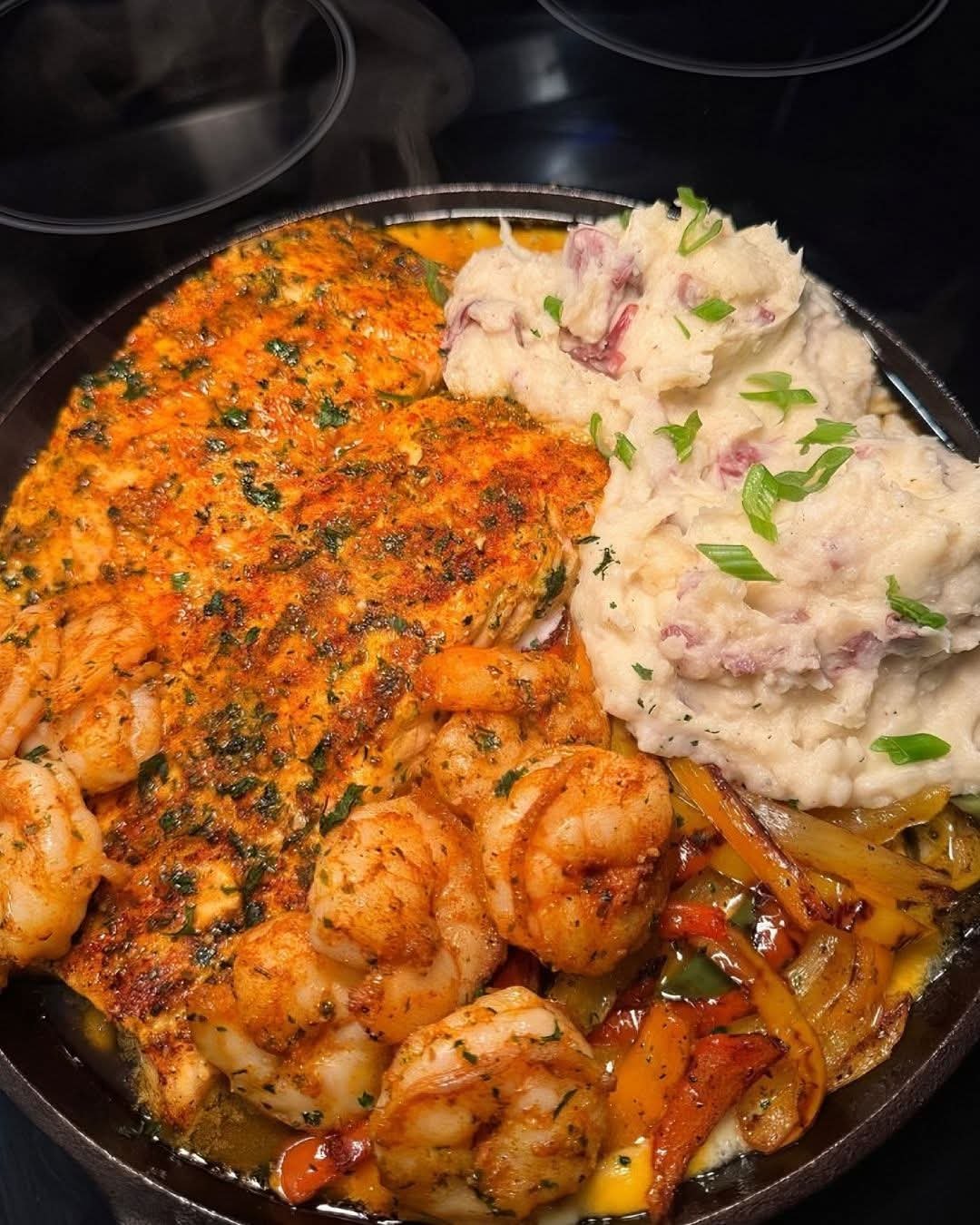 A hearty, protein-rich comfort plate featuring pan-seared (mild) blackened salmon and shrimp, sweet sautéed peppers, and creamy mashed potatoes. This version keeps the seasoning non-spicy while delivering bold flavor with herbs, garlic, and olive oil.