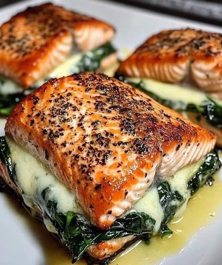 Blackened Salmon Stuffed with Spinach and Parmesan is a flavorful dish that combines the smoky spice of blackened seasoning with a creamy, cheesy filling. The salmon fillet is butterflied and generously seasoned with a blend of paprika, garlic powder, cayenne, and herbs. It’s then stuffed with a rich mixture of sauteed spinach, cream cheese, Parmesan, and a hint of garlic for extra flavor. The fillet is pan-seared or baked to perfection, resulting in a crisp, savory crust and a tender, juicy interior. This dish is both visually stunning and packed with bold, delicious flavors, perfect for a special meal or entertaining guests.
