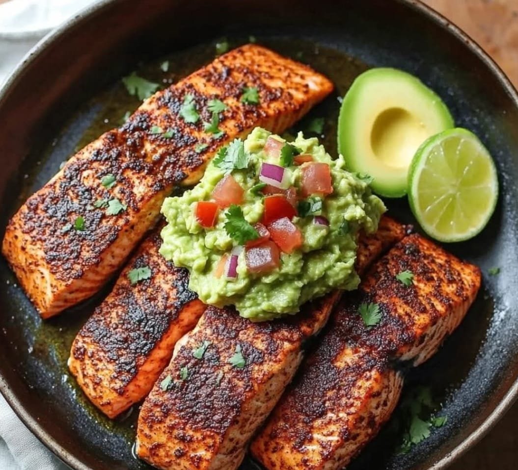 This Blackened Salmon with Guacamole is a perfect combination of bold, smoky flavors and creamy freshness. The blackened salmon is coated in a spice mix that creates a deliciously crispy crust, while the guacamole adds a creamy, tangy contrast. This dish is simple yet packed with flavor, making it a great option for a healthy dinner or lunch. The salmon is rich in omega-3, while the guacamole provides healthy fats and a burst of freshness.