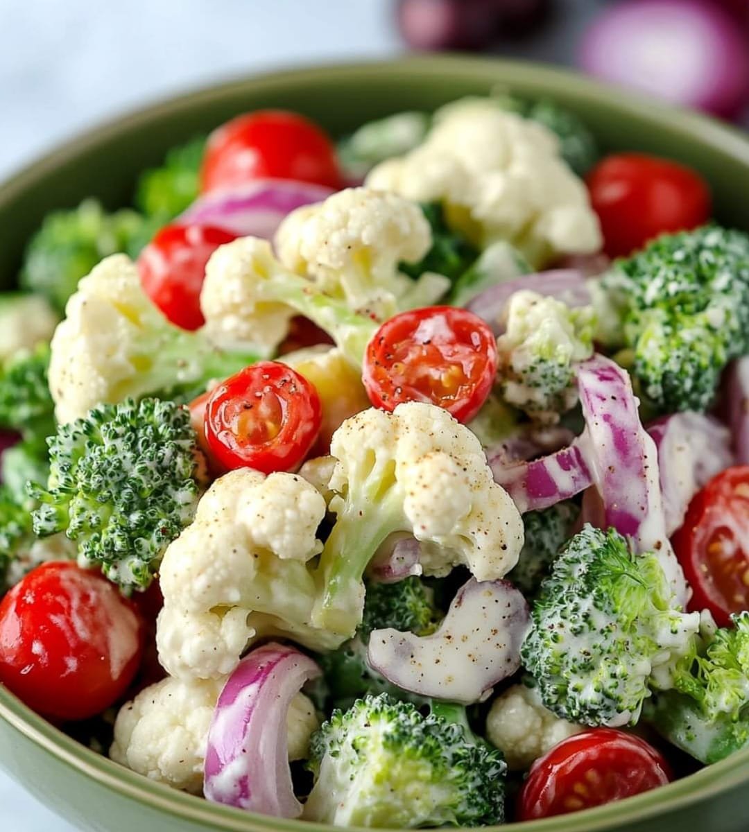 This broccoli cauliflower cherry tomato salad is versatile and customizable. With its vibrant red, green, and white colors, it makes a beautiful addition to any holiday table!
