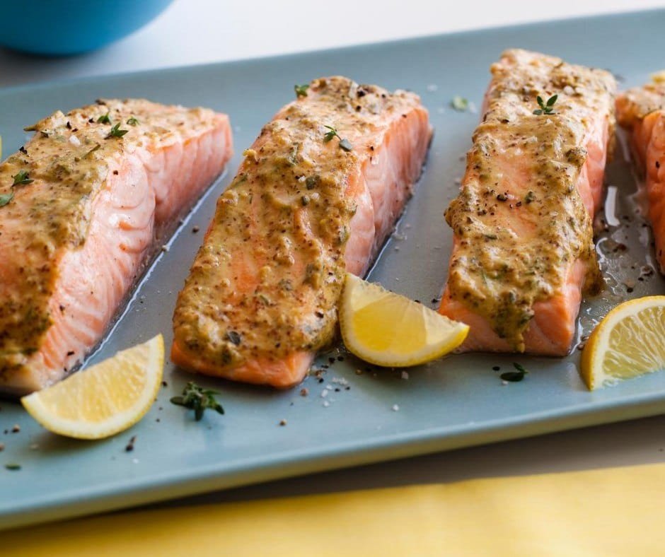 Get the broiler ready to go. Utilize aluminum foil to line a hefty baking sheet with a rim. Apply a nonstick spray to the foil and spritz it. After placing the salmon fillets on the baking sheet, season them with salt and pepper and arrange them in a pattern. For two minutes, broil the food. Sprinkle the fillets with the mustard sauce using a spoon. Over approximately five more minutes, continue broiling the fillets until they are golden brown and barely cooked through.