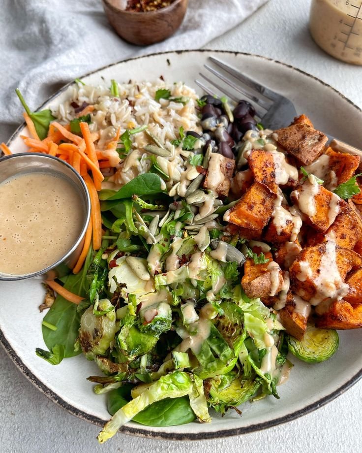 A Buddha bowl is a vibrant, nourishing mix of grains, roasted vegetables, fresh veggies, protein, and a creamy sauce.