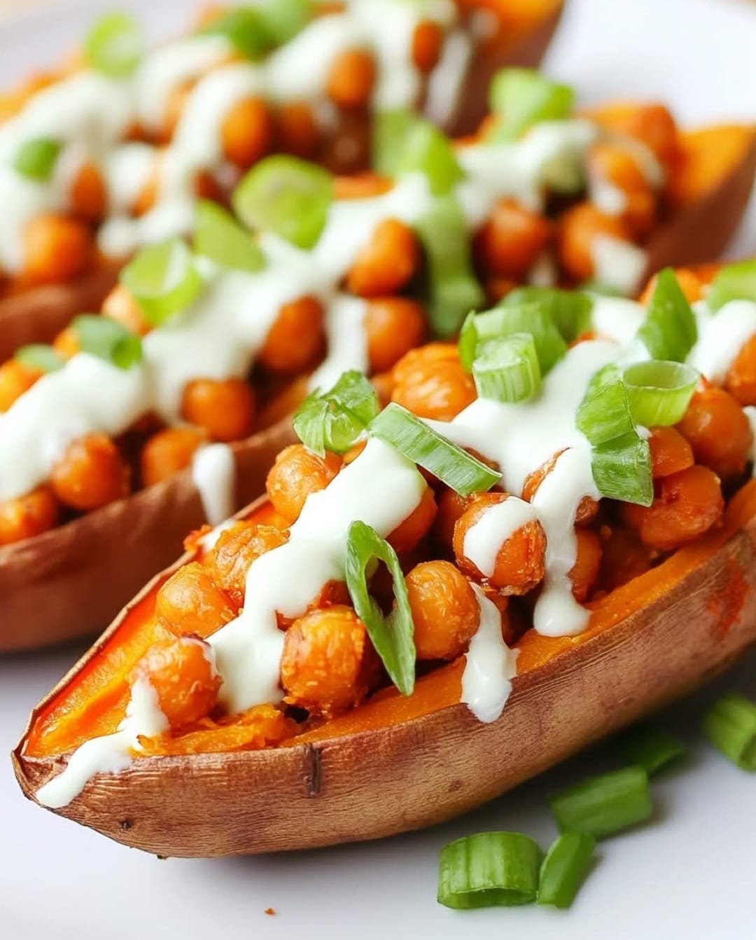 These Buffalo Chickpea Stuffed Sweet Potatoes are a delicious combination of sweet, spicy, and savory flavors. Roasted sweet potatoes provide a soft and naturally sweet base, while the spicy buffalo chickpeas add a satisfying crunch and heat. Topped with a creamy dressing and fresh herbs, this dish is packed with nutrients and perfect for a hearty vegetarian meal or side.