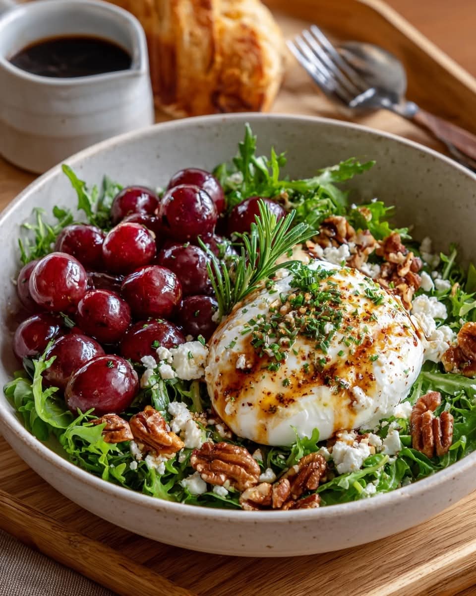 This elegant salad blends the creamy richness of burrata with the sweet, slightly caramelized flavors of roasted grapes infused with rosemary. The warm grapes gently soften the cheese, creating a luscious texture, while a drizzle of honey-balsamic dressing ties everything together. Perfect as an appetizer, light lunch, or sophisticated side dish for a Mediterranean-inspired meal.