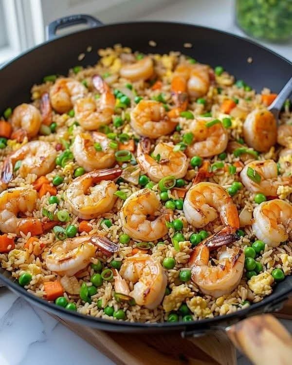 - Return the cooked shrimp to the skillet and mix with the rice and vegetables.