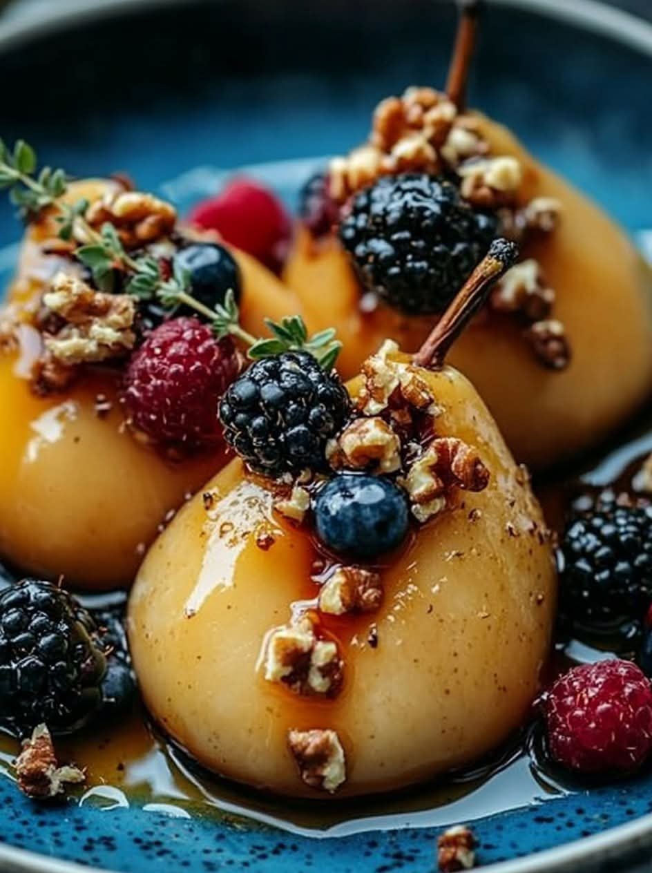 This dish features ripe pears baked until soft and golden with a caramel-like glaze. The warm fruit pairs perfectly with the salty richness of blue cheese, fresh berry brightness, and nutty crunch from walnuts. The thyme adds a subtle herbal aroma that elevates the entire flavor profile.